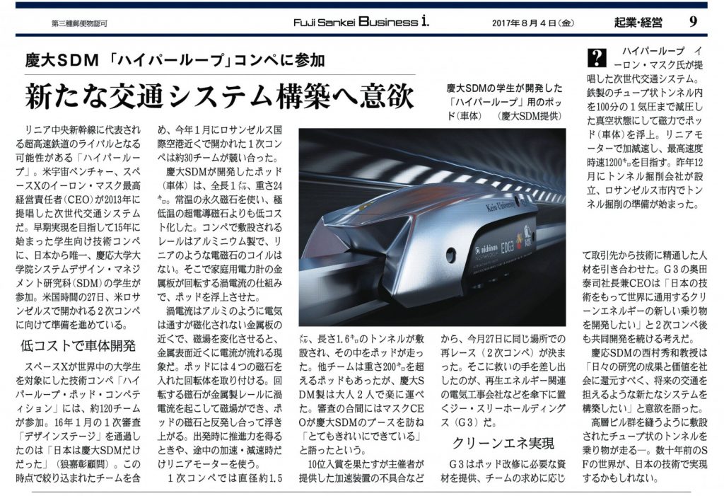 本日2017年8月4日(金)発売の日刊総合経済紙「フジサンケイビジネスアイ」にて、当社グループにおける慶應アルファとの共同開発中のハイパーループの記事が掲載されました。